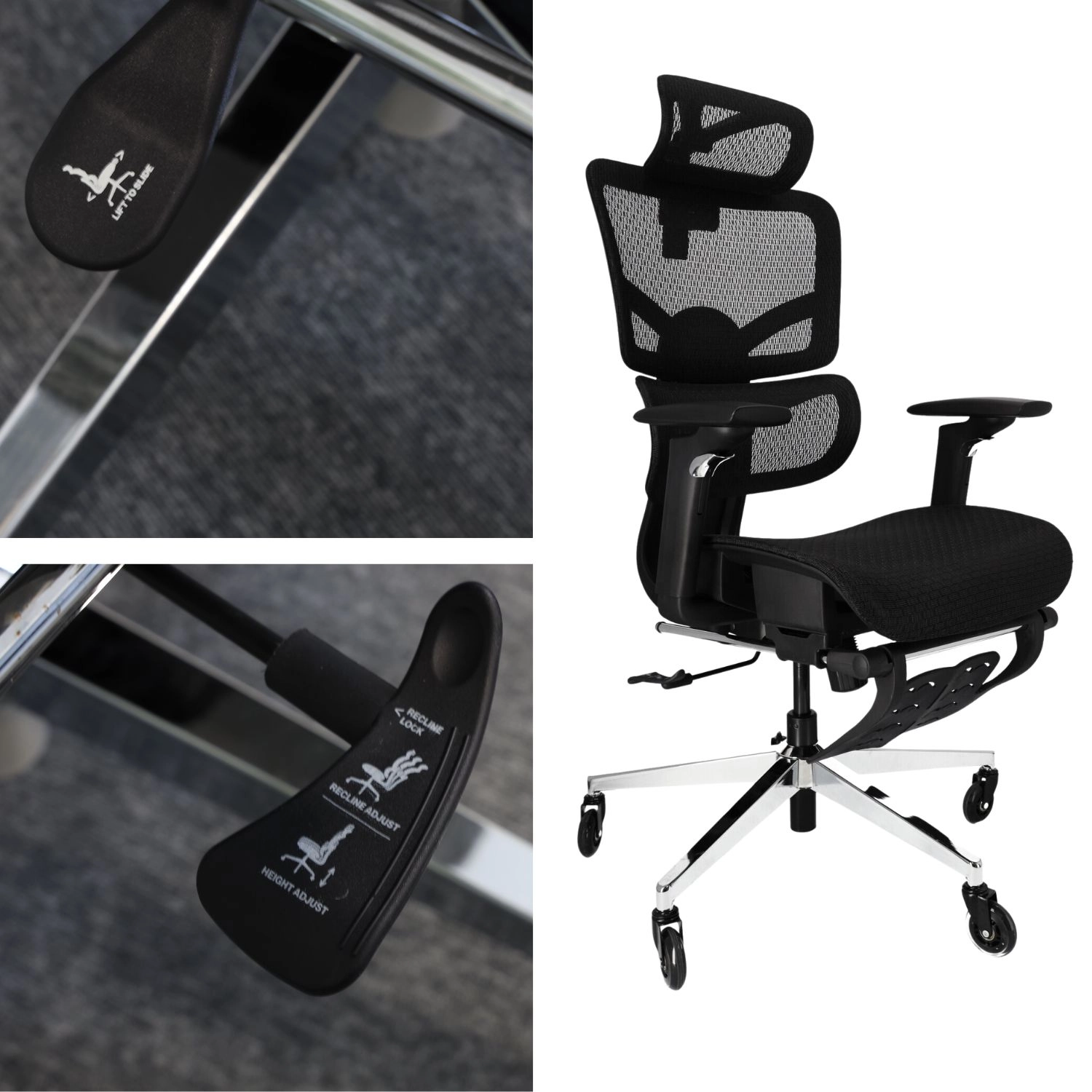 Nastavitelná opěrka hlavy, výška opěráku, hloubka sedu a 4stupňový zámek náklonu až 135° vám umožní najít ideální pozici pro práci i odpočinek.