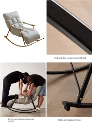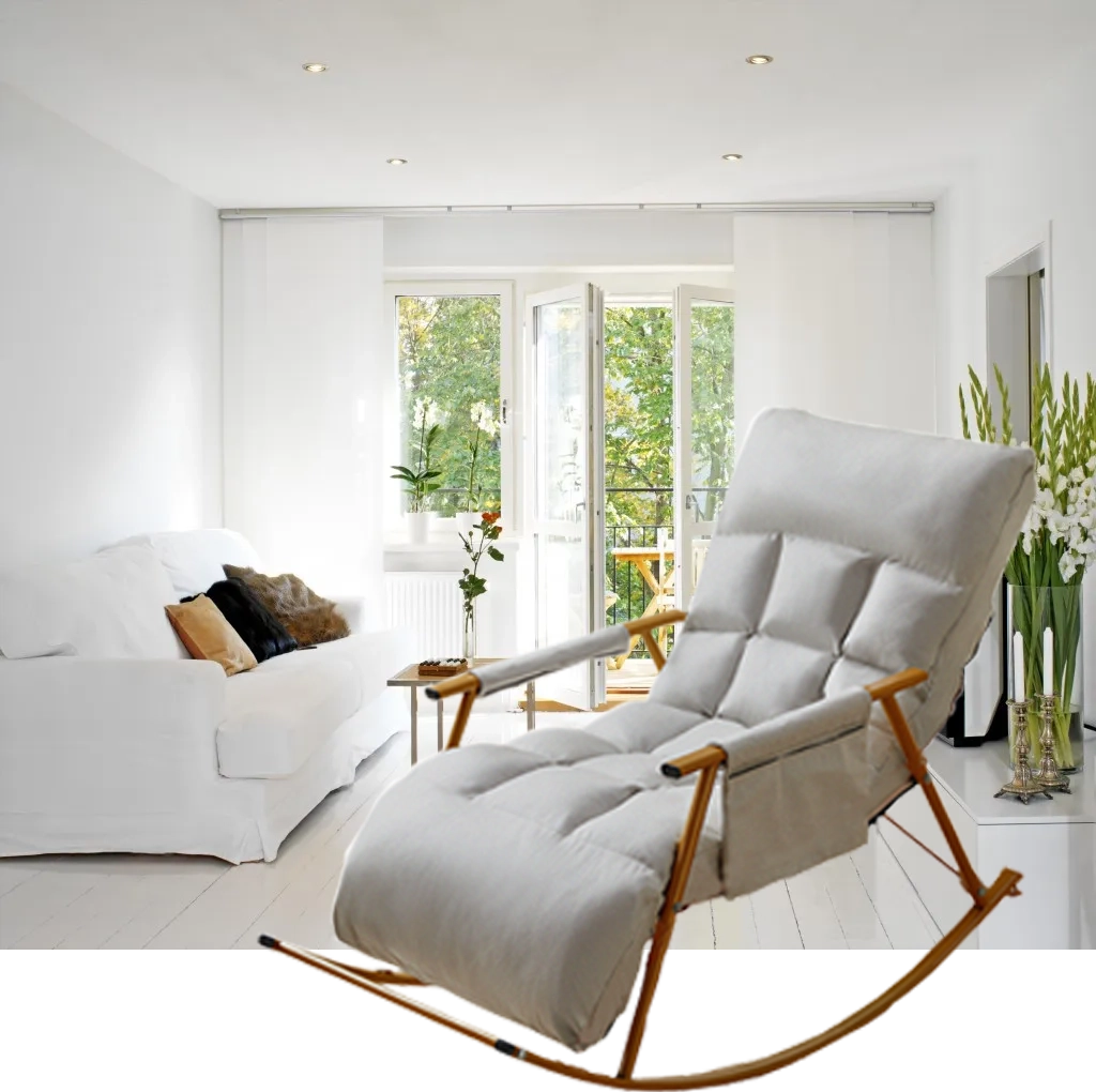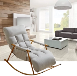 Toto moderní houpací křeslo kombinuje čistý design a vysoký komfort. Měkké čalounění z PP bavlny (polyester) příjemně obejme tělo, zatímco stabilní ocelový rám a odolná zlatá základna zajišťují bezpečné a plynulé houpání. Díky skládací konstrukci jej snadno uložíte, když zrovna odpočíváte jinde.