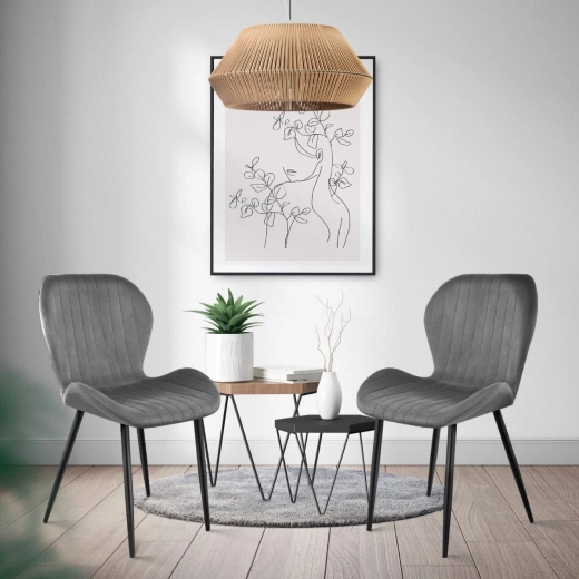 Sada čtyř designových židlí v tmavě šedé barvě skvěle doplní jídelní stůl v kuchyni či obýváku a zapadne i do kanceláře, restaurace nebo čekárny. Příjemný sametový potah s podélným prošíváním dodává židlím nadčasový vzhled a snadno se kombinuje s aktuálními interiéry.