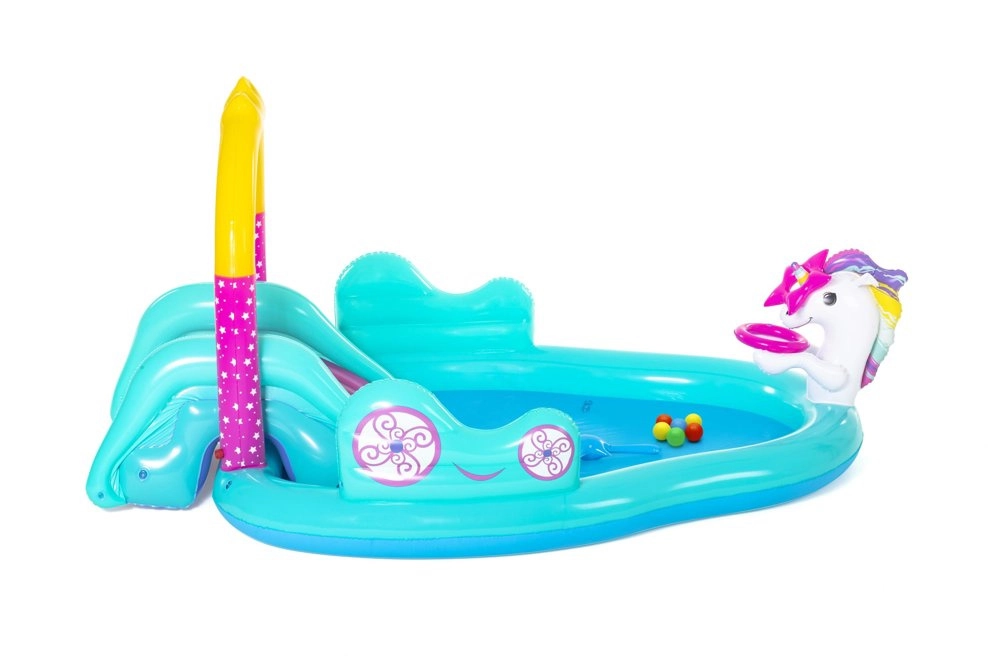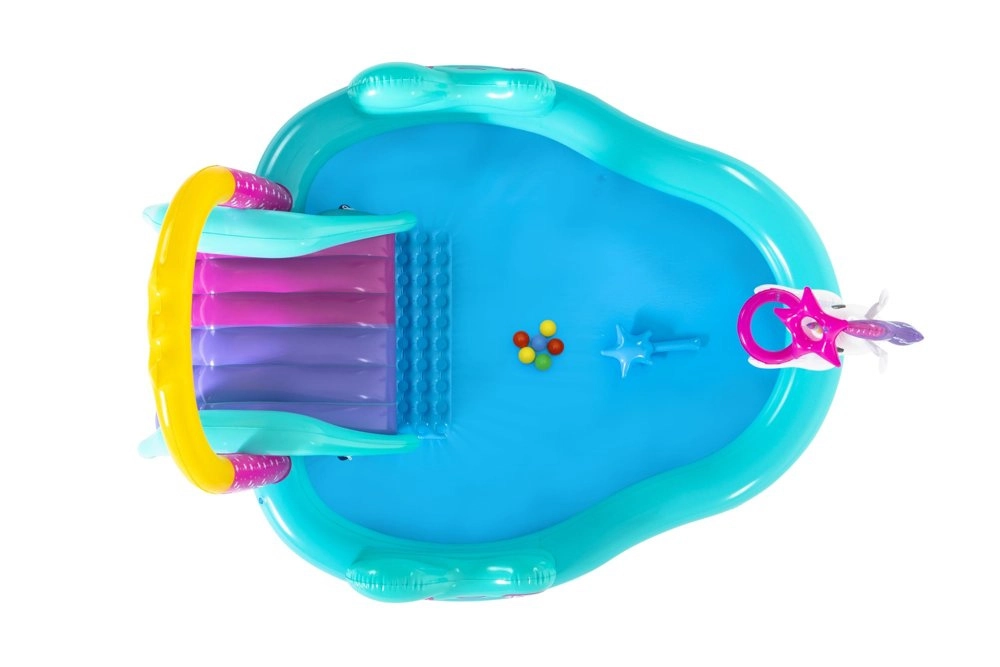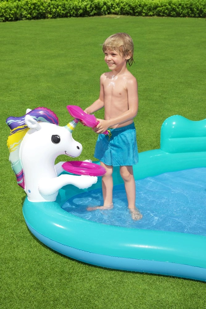 Proměňte zahradu v vodní centrum zábavy pro děti! Nafukovací hřiště s motivem jednorožce nabízí bazén s kapacitou 220 l, šplouchací obloukový sprchovač po připojení hadice a širokou skluzavku pro dvojitou porci radosti. Odolný PVC materiál, pohodlné rychlovypouštění a bohaté příslušenství zajistí dlouhé hodiny bezpečné zábavy.