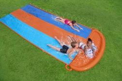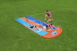 Rozjeďte léto naplno s vodním skluzem BESTWAY o délce 4,88 m a třemi jízdními pruhy pro závodní klání dětí. Integrované sprchy po stranách udržují povrch kluzký, stačí připojit zahradní hadici a zábava může začít. Odolný PVC materiál, měkká dopadová část a jednoduché zprovoznění bez nářadí zajistí bezpečné a nekonečné vodní radovánky pro děti od 3 let.