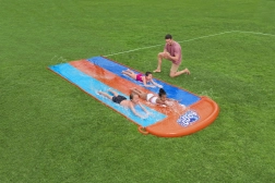 Uspořádejte domácí vodní závody přímo na zahradě. Trojitý skluz BESTWAY nabízí tři paralelní dráhy, díky nimž mohou děti soutěžit bok po boku. Postranní sprchovače vytvářejí jemnou vodní kaskádu a udržují povrch perfektně mokrý pro rychlý a plynulý skluz.