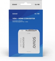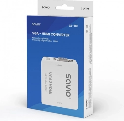 - Konverze VGA → HDMI, přenos obrazu a stereo zvuku