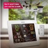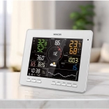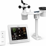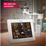 Velký 7,8" TRUE BLACK LCD s barevným rozlišením údajů ukazuje nejen vnitřní a venkovní teplotu a vlhkost s indikací komfortu, ale i tlak, vítr, srážky, UV index, intenzitu světla a přehledné grafy trendů. Nechybí 12–24h předpověď z tlakového trendu, čas, kalendář, fáze Měsíce a východ/západ Slunce a praktické alarmy na extrémy počasí.