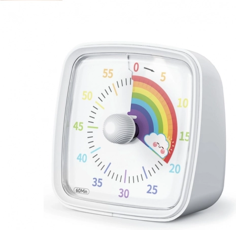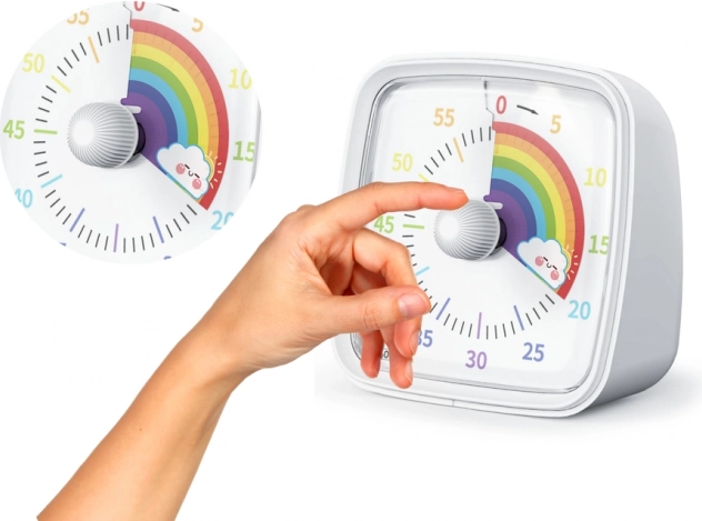 Při otáčení knoflíku se plocha postupně vybarví duhou. Děti tak snadno vidí, kolik času zbývá – ideální pro učení, úkoly i pauzy.