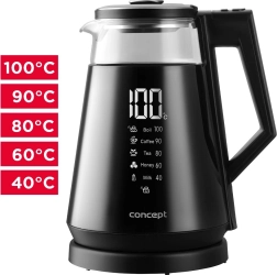 Konvice umožňuje regulaci teploty ve čtyřech krocích (40°C, 60°C, 80°C, 100°C). Díky čitelnému digitálnímu displeji budete mít dokonalý přehled o nastaveném programu a aktuální teplotě vody. Funkce KEEP WARM udrží nastavenou teplotu až po dobu 4 hodin.