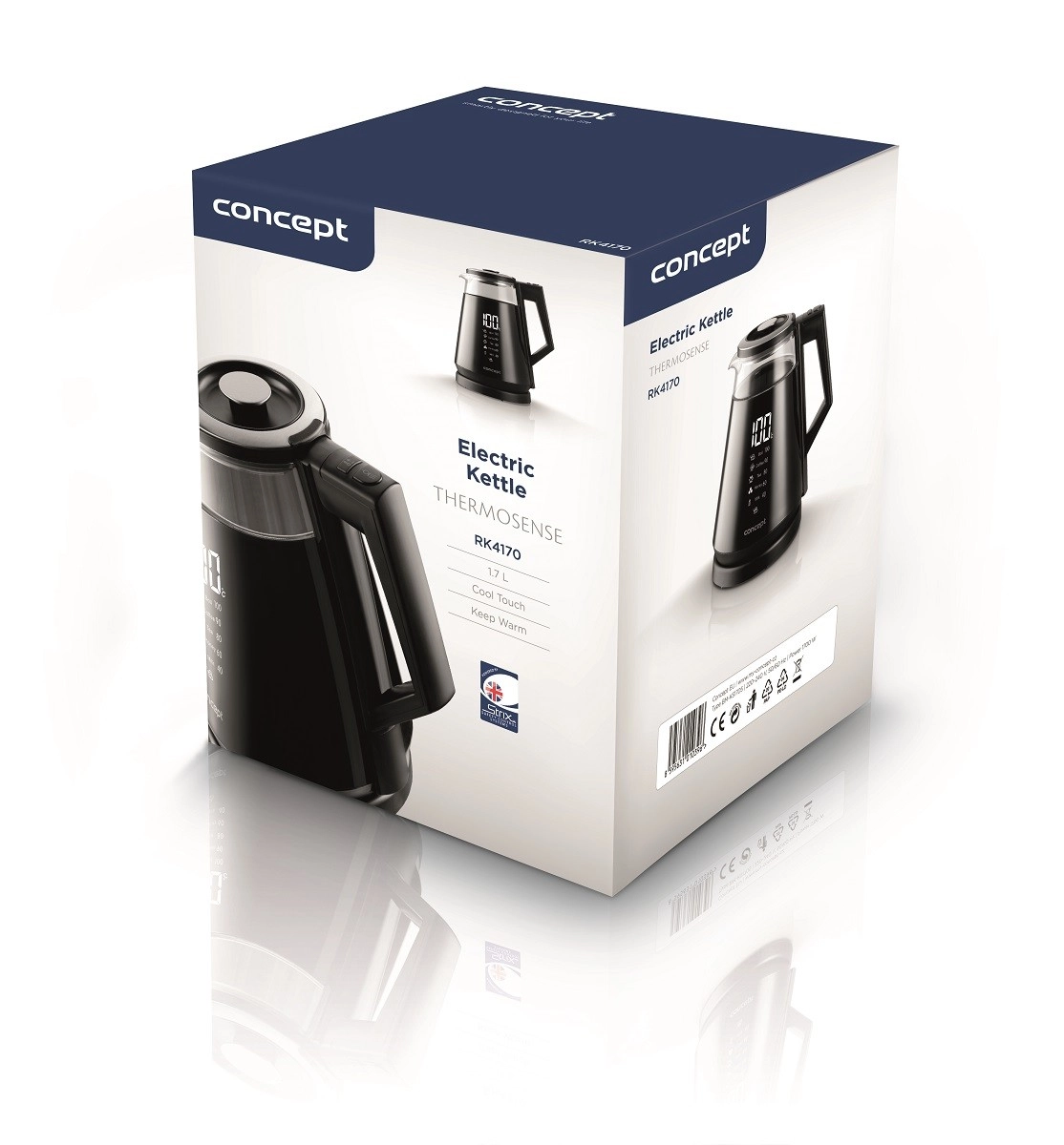 ThermoSense RK4170 je moderní skleněná rychlovarná konvice, která se vyznačuje elegantním designem a čitelným digitálním displejem. Nabízí kapacitu 1,7 litrů, možnost regulace teploty ve čtyřech krocích (40°C, 60°C, 80°C, 100°C) a funkci udržení teploty (KEEP WARM) po dobu až 4 hodin.