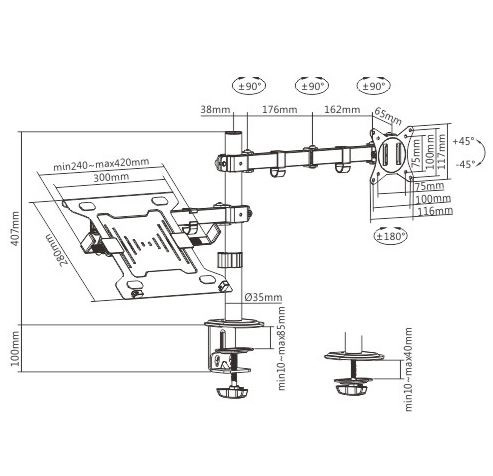 Silný svěrný držák (clamp) se spolehlivě upevní k desce stolu a praktické klipsy pomohou zkrotit kabely. Kompatibilita s VESA 75×75 a 100×100 mm zajišťuje bezproblémovou instalaci pro téměř každý LCD monitor do 32″, zatímco podstavec bezpečně unese notebook do 15,6″.