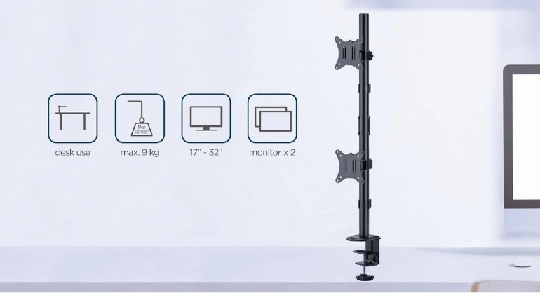 Ušetřete místo na stole a zvyšte ergonomii s tímto robustním vertikálním držákem pro dva monitory 17–32". Nabízí otočení, náklon a nastavení výšky, kompatibilitu VESA 75x75 a 100x100, pevné uchycení pomocí svorky nebo průchodky a integrované vedení kabelů pro čisté a přehledné pracoviště.
