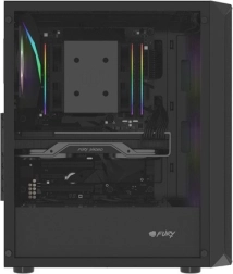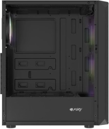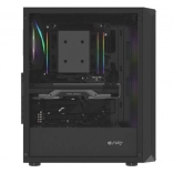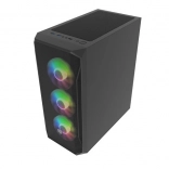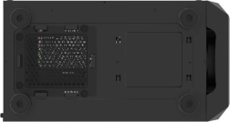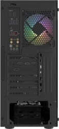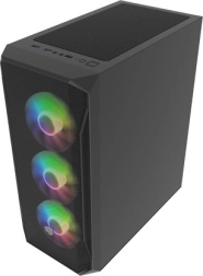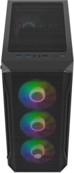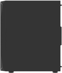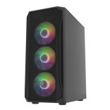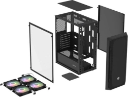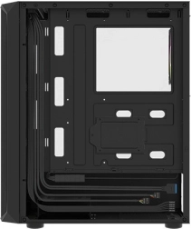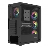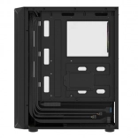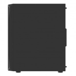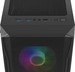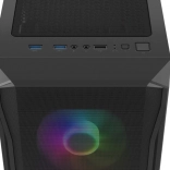 Horní I/O panel je připraven na vše podstatné: 2× USB 3.0, 1× USB 2.0, HD Audio 3,5 mm pro sluchátka a mikrofon, tlačítka Power/Reset a indikační diody. Tvrzené sklo na levé bočnici zvýrazní vaše komponenty i RGB efekty, zatímco husté prachové filtry udrží vnitřek dlouhodobě čistý.