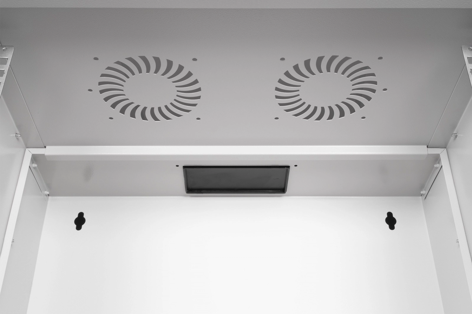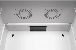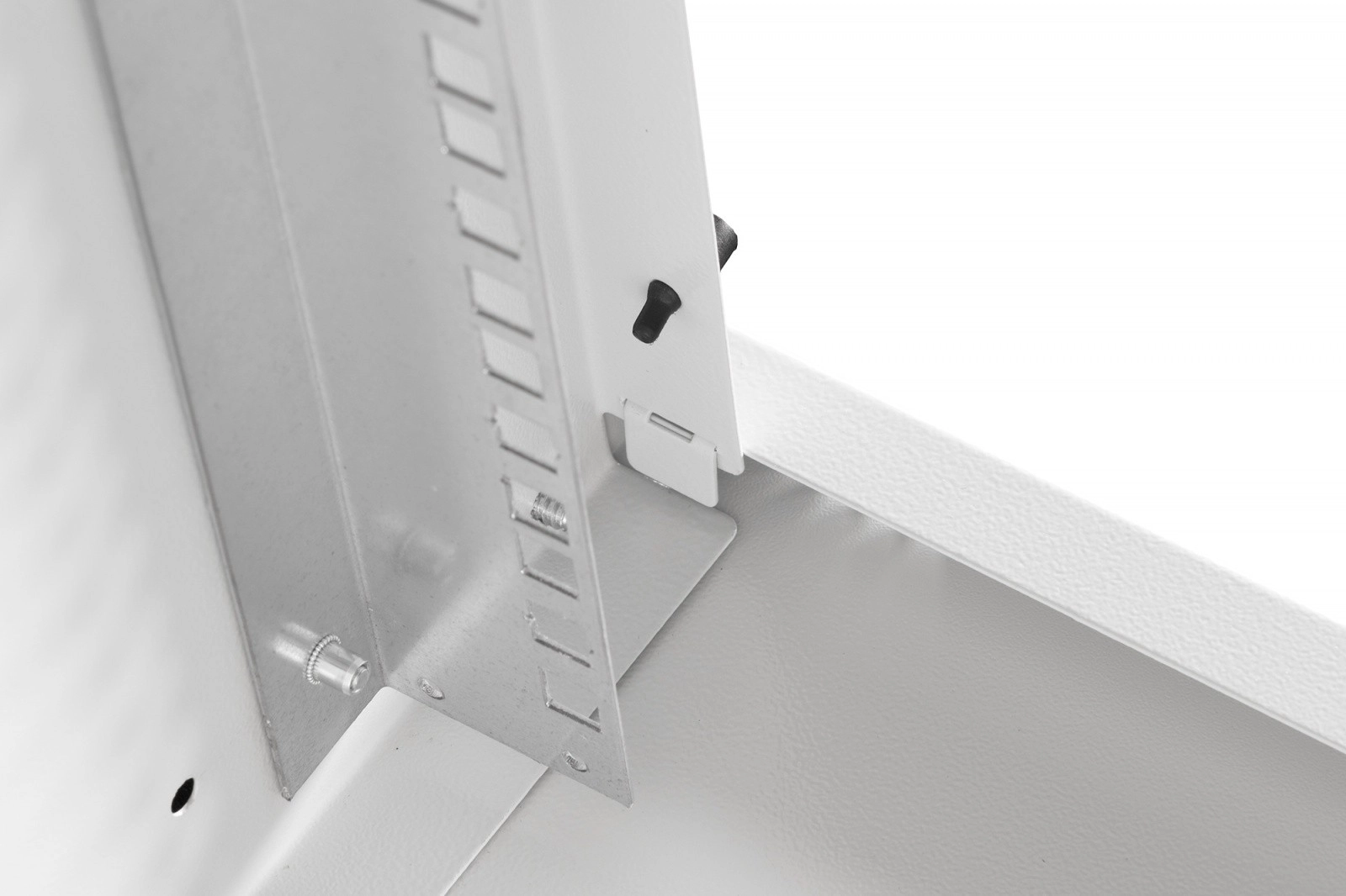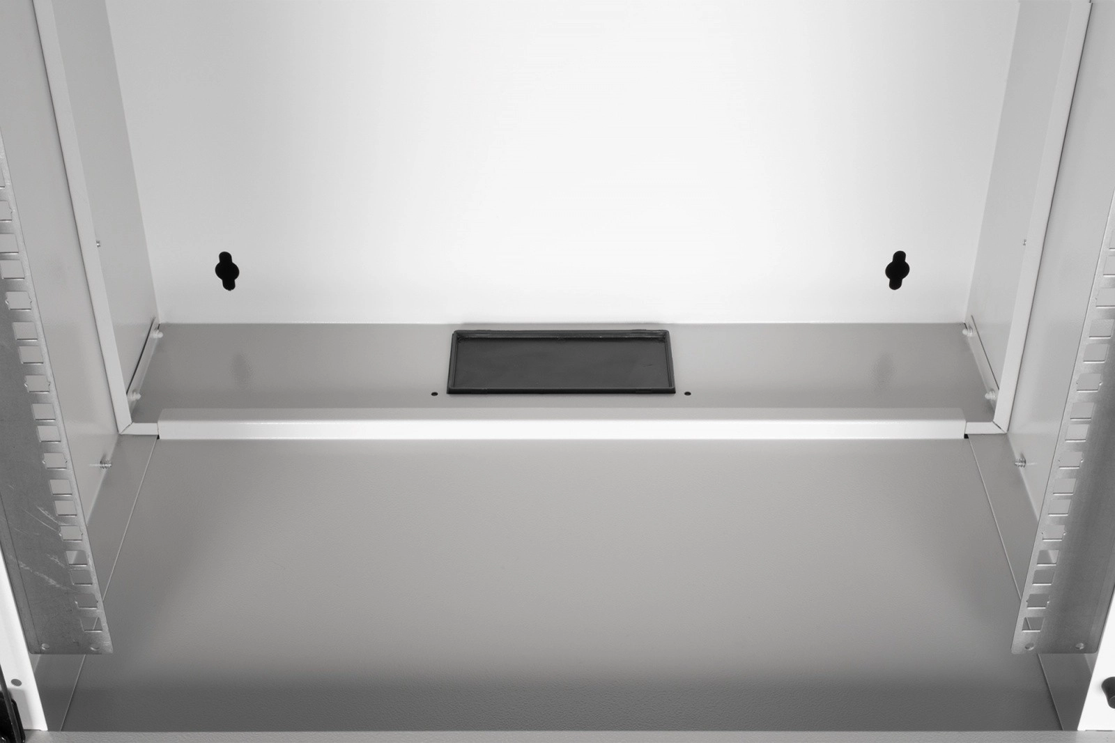 Skříň je dodávána nezmontovaná v plochém balení pro úsporu místa a nákladů na dopravu. Díky přehlednému návodu je instalace rychlá a zvládnete ji v několika krocích. Přední 19" profily (483 mm) jsou pozinkované a jejich hloubku lze plynule nastavit pro přesné usazení zařízení. Horní průchod s kartáčovou lištou a spodní plastová průchodka usnadňují čisté vedení kabeláže, zatímco větrací perforace podporují aktivní i pasivní chlazení.