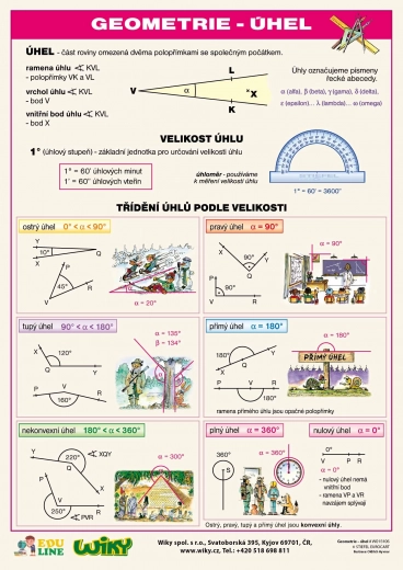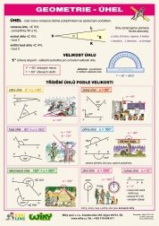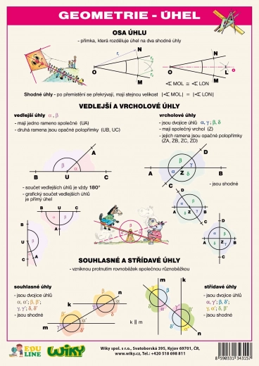 Na zadní straně naleznete informace o ose úhlu a dalších tématech jako vedlejší, vrcholové, souhlasné a střídavé úhly. Tato tabulka je ideální pro studenty a učitele jako skvělý pomocník při studiu geometrie.