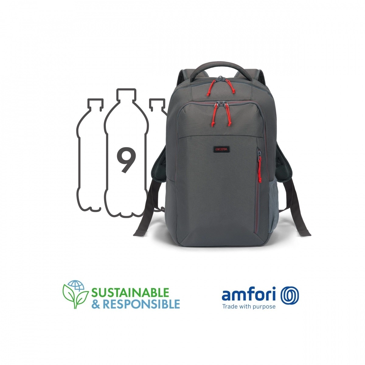 Batoh je vyroben z materiálu odpovídajícího 9 recyklovaným PET lahvím – odolná volba šetrná k přírodě.
