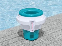Integrovaný teploměr umožňuje průběžně sledovat teplotu vody, zatímco dávkovač rovnoměrně uvolňuje chemii pro křišťálově čistou vodu.