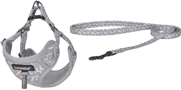 Vše, co potřebujete pro bezpečné procházky: lehký postroj a vodítko o délce 1,5 m v elegantní světle šedé. Praktické, stylové a připravené k okamžitému použití.