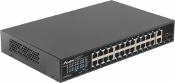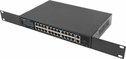 Spolehlivý přepínač LANBERG s 24x Gigabit PoE+, 2x Gigabit uplink a 2x SFP nabízí reálný PoE budget 250 W, rozšířený dosah až 250 m v režimu EXTEND a ochranu 4 kV proti přepětí – ideální pro kamerové systémy, IP/VoIP a podnikové sítě.