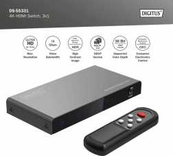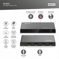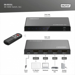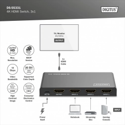 Už žádné neustálé přepojování kabelů. Kompaktní přepínač DIGITUS 4K HDMI 3×1 elegantně rozšíří vaše zařízení o tři plnohodnotné HDMI vstupy. Díky podpoře Ultra HD 4K při 60 Hz a HDCP 2.3 si vychutnáte ostrý obraz a plynulé přehrávání z herních konzolí, set-top boxů, notebooků či přehrávačů.
