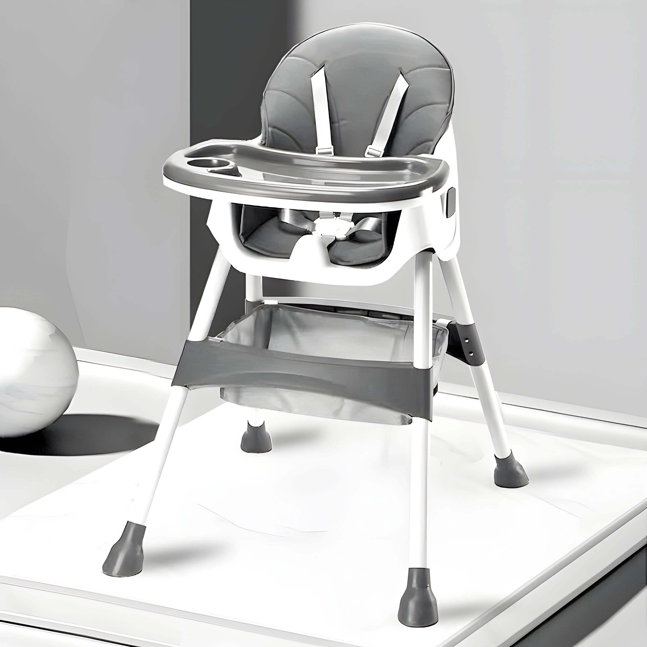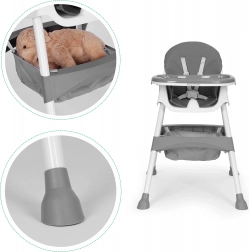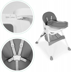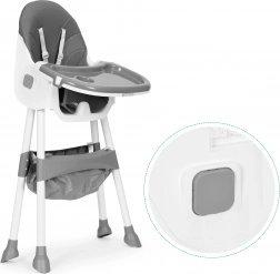 Bezpečnost zajišťuje 5bodový pás a stabilní kovové nohy s protiskluzovými koncovkami. Odnímatelný dvouvrstvý tác má vyvýšené okraje a držák na kelímek, horní vrstvu lze mýt v myčce. Skládací konstrukce šetří místo a košík pod sedákem udrží bryndáčky, ubrousky i hračky vždy po ruce.