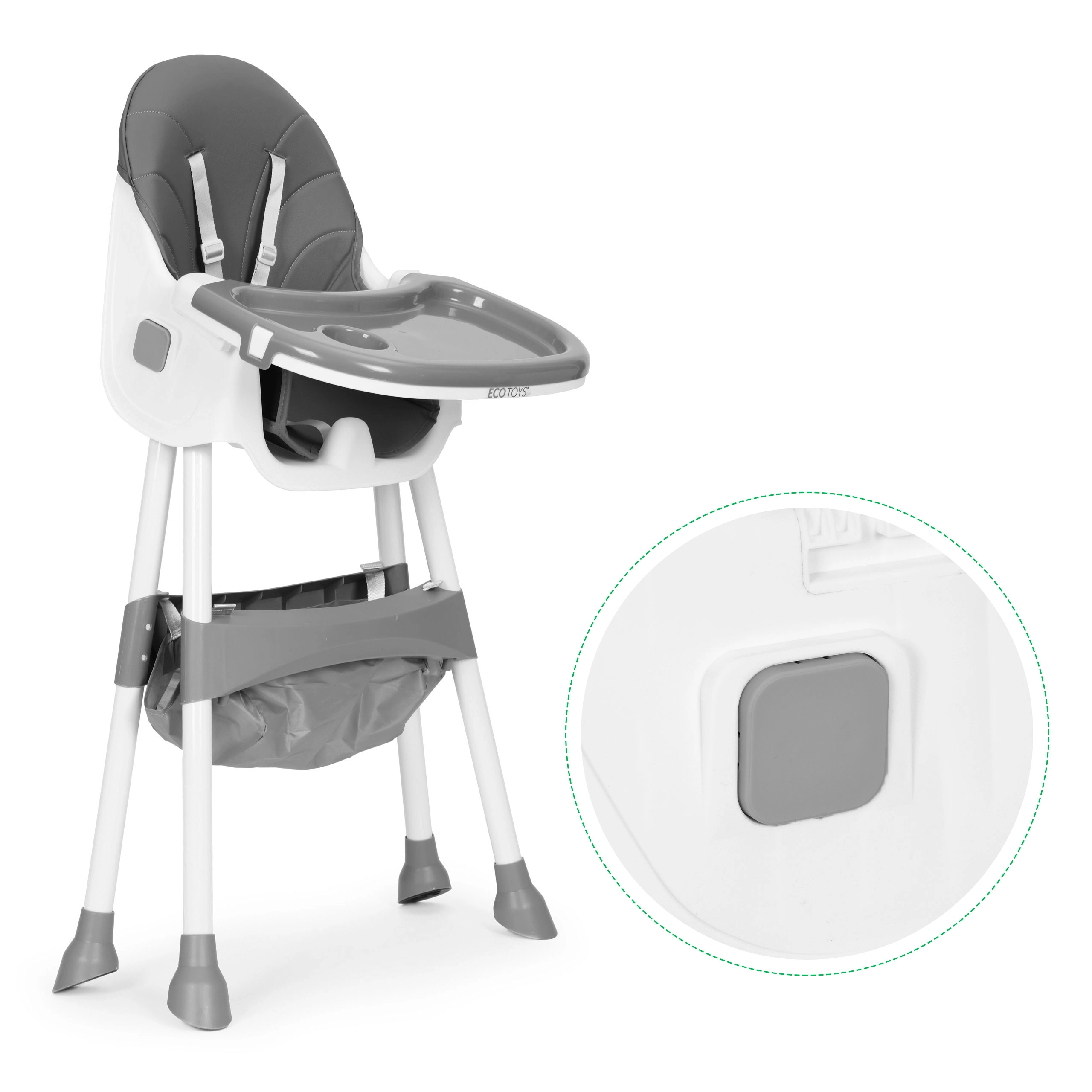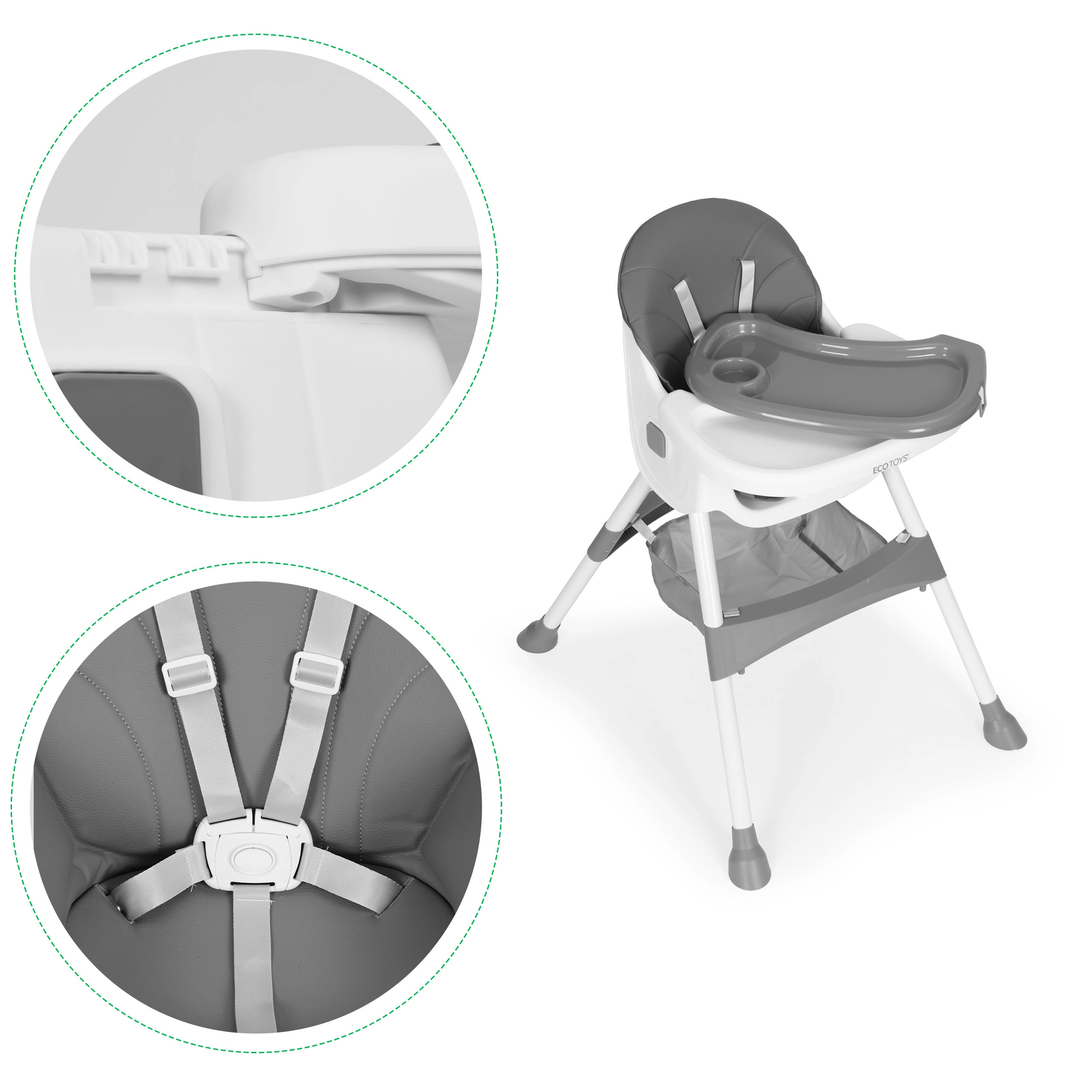 Jídelní židlička ECOTOYS usnadní společné stolování i první krmení. Díky širokému tácu s možností nastavení ve 3 pozicích dítě pohodlně jí i objevuje hru – staví kostky nebo kreslí. Sedák s potahem z odolné eko kůže stačí otřít, takže údržba je rychlá a bez starostí.