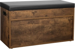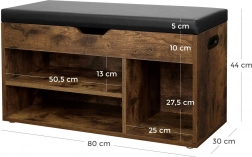 Dřevěná lavice na boty v loft stylu nabízí moderní vzhled a praktičnost v jednom. Vyrobena z dřevotřísky, disponuje měkkým, černým sedátkem na vrchu, které je snadno odnímatelné díky suchému zipu. Pod ním se nachází dostatek úložného místa pro papuče nebo drobné kusy oblečení jako čepice, šály nebo rukavice.