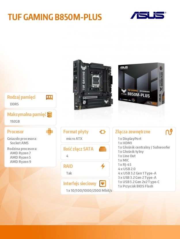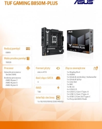 Základní deska ASUS TUF GAMING B850M-PLUS je navržena pro dlouhodobou stabilitu, spolehlivost a výkonný herní výkon. Využívá možnosti moderních procesorů AMD Ryzen, nabízí vylepšené napájení, komplexní chlazení a širokou konektivitu pro náročné hráče i tvůrce. Testy odolnosti TUF a komponenty vojenské třídy zajišťují jistotu i při dlouhých herních maratonech.