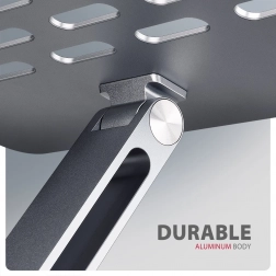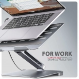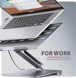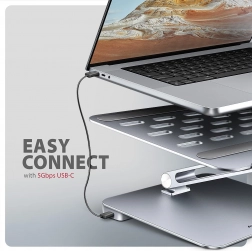 Elegantní a odolná konstrukce z hliníkové slitiny poskytuje pasivní chlazení a stabilitu, zatímco protiskluzové plochy chrání zařízení před poškrábáním. Stojan s dvojitým kloubem umožňuje přesné nastavení výšky až 205 mm a úhlu náklonu, aby byl displej v jedné rovině s externím monitorem. Hub rozšíří váš notebook o HDMI 4K/60 Hz, 3x USB-A 5Gbps, RJ‑45 Gigabit a USB‑C PD vstup 100 W.