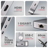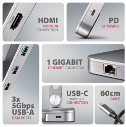 Výstup HDMI podporuje až 4K/60 Hz, 2K/120 Hz a 1080p/200 Hz včetně HDR a vícekanálového zvuku. USB-A 5Gbps obslouží externí disky (až dva současně), periférie i nabíjení až 7,5 W. Gigabit Ethernet zajistí stabilní síťové připojení, a přes USB‑C PD 3.0 nabijete notebook výkonem až 100 W. Připojení je snadné díky Plug & Play a Hot Plug.