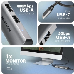 Rozšiřte konektivitu svého zařízení jediným kompaktním řešením. AXAGON USB-C hub 4v1 přidá HDMI výstup pro monitor/TV/projektor a tři porty USB-A pro periférie a úložiště. Přenosy až 5 Gb/s (USB 3.2 Gen 1) zajistí rychlou práci s daty, zatímco dvojice portů 480 Mb/s je ideální pro klávesnice, myši či flash disky.
