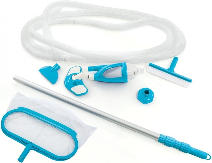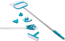 Udržujte vodu v bazénu křišťálově čistou a bezpečnou pro koupání. Tato univerzální sada kombinuje ruční vysavač dna, síťku a kartáč na stěny s odolnou teleskopickou tyčí (279 cm), takže dosáhnete do všech rohů bez námahy. Ideální pro nadzemní i zapuštěné bazény do průměru 549 cm.