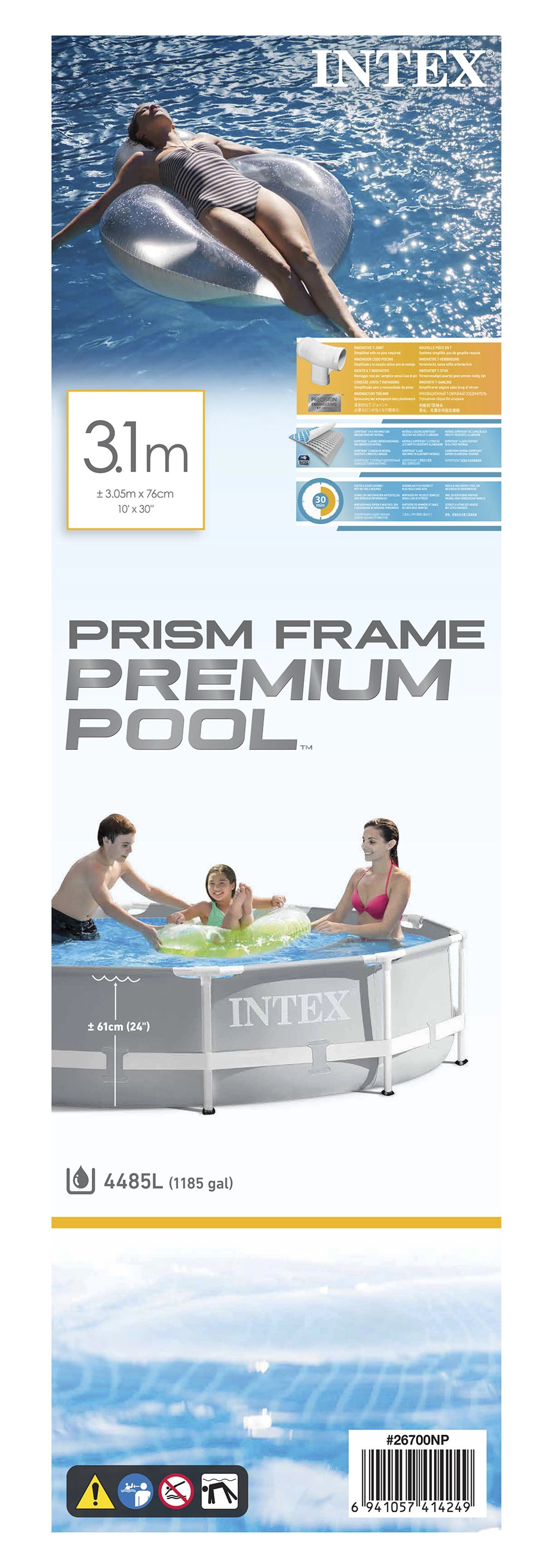 Montáž je intuitivní a rychlá – stačí sestavit stelaž, rozprostřít nepropustnou vložku a napustit vodu. Vnitřní stěny s mozaikovým vzorem zlepšují estetiku i pocit čisté vody. Konstrukce PRISM FRAME™ poskytuje vysokou stabilitu a dlouhou životnost.