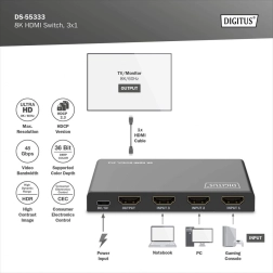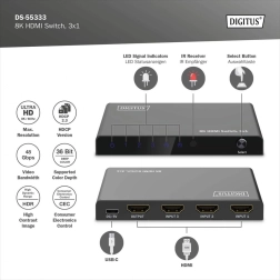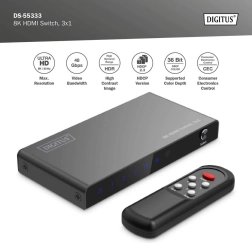 Elegantní a kompaktní přepínač DIGITUS 3×1 HDMI umožní připojit až tři HDMI zdroje k jednomu displeji. Ideální pro TV na zdi, herní konzole, přehrávače či počítače – stačí jediný HDMI kabel k obrazovce a mezi zdroji přepínáte na dálku.