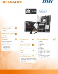 MSI PRO B840-P WIFI vyniká čistým designem v harmonické stříbrno‑černé kombinaci, která skvěle zapadne do bílých i černých sestav. Výkonná napájecí kaskáda Direct 7+2+1, 6vrstvé PCB s 2oz mědí a technologie Core Boost a Memory Boost zajišťují stabilitu a vysoký výkon pro moderní procesory AMD Ryzen.