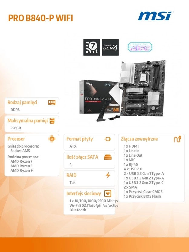 Moderní konektivita zahrnuje Wi‑Fi 7 a 2.5G LAN pro rychlou a stabilní síť, slot PCIe 4.0 pro grafické karty a úložiště Lightning Gen 4 x4 M.2 pro bleskové načítání systému i her. Funkce Audio Boost pak doručí čistý, prostorový zvuk studiové kvality.
