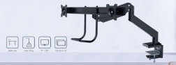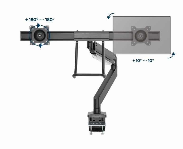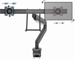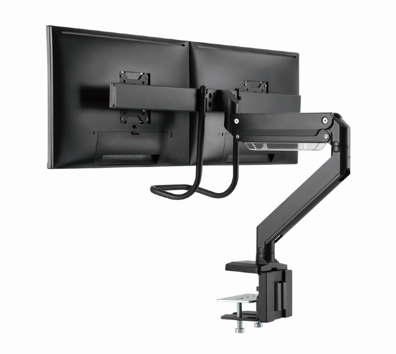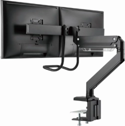 Tento dvojitý držák monitorů kombinuje štíhlý design a vysokou nosnost pro profesionální i domácí pracoviště. Ramena se plynule otáčejí, vysouvají, zasouvají a naklápějí, takže snadno nastavíte ideální úhel čtení a snížíte namáhání krku i zad.