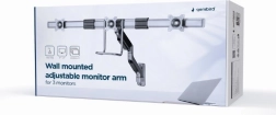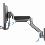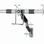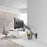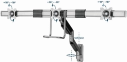 Nástěnný držák pro tři monitory vedle sebe umožňuje precizní umístění obrazovek a maximální úsporu místa na stole. Lehká, ale pevná konstrukce s plynovou pružinou zajišťuje plynulé vyvažování a pohodlné nastavení jednou rukou.