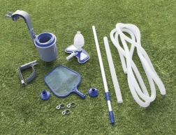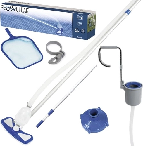 Efektivní údržba bazénu: Sada obsahuje tři základní nástroje – skimmer, vysavač a síťku, což umožňuje snadné odstranění nečistot z hladiny bazénu.