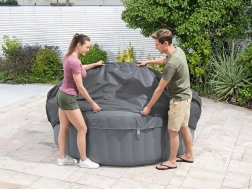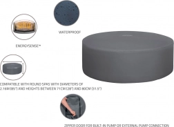 Montáž je rychlá a intuitivní. Nastavitelný obvodový pás se zabezpečovacími klipy zajistí pevné uchycení, zatímco integrovaný zip umožní bezproblémové napojení na čerpadlo bez nutnosti kryt sundávat. Kryt je kompatibilní s modely Lay‑Z‑Spa St. Moritz, Monaco, Santorini HydroJet Pro a dalšími kulatými vířivkami o průměru 216 cm.