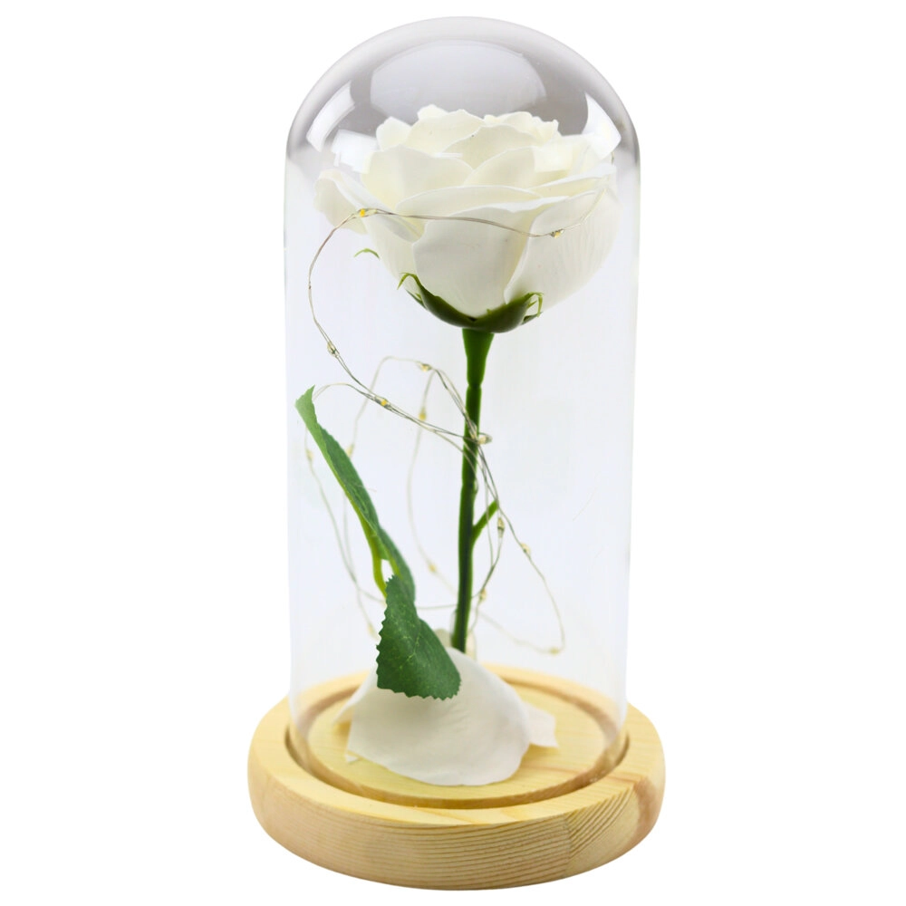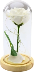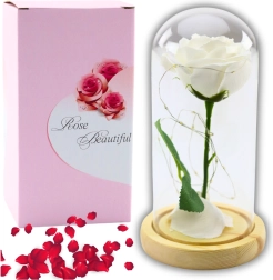 Tato věčná bílá růže pod skleněnou kopulí je nadčasovým symbolem lásky a elegance. Díky teplému bílému světlu LED se stává výrazným doplňkem obývacího pokoje, ložnice i vstupní haly. Skleněná kopule chrání květ před prachem a podtrhuje jeho realistické detaily, zatímco přírodní dřevěná základna dodává dekoraci hřejivý, přírodní charakter.
