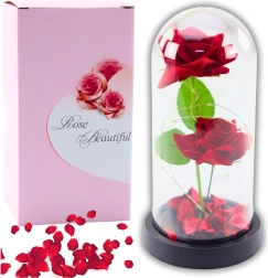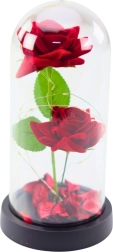 Okouzlující věčné růže v kopuli s LED světýlky jsou symbolem trvalé lásky a elegantní dekorací pro každý domov. Dvě realistické růže doplňují volně rozptýlené okvětní lístky, které v kombinaci s teplým bílým světlem vytvářejí útulnou a romantickou náladu.