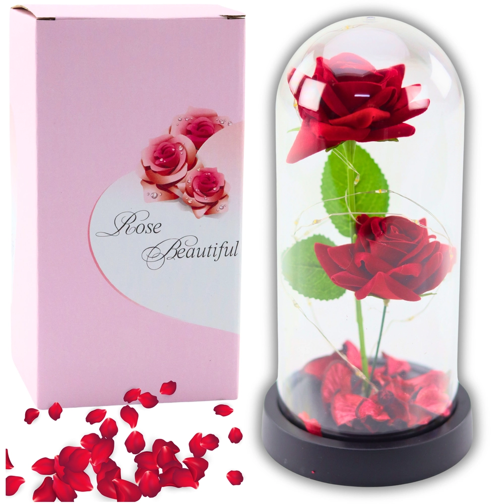 Elegantní dekorace a výjimečný dárek v jednom: dvě věčné červené růže v kopuli s jemným LED osvětlením a rozptýlenými okvětními lístky vytvářejí romantickou atmosféru bez nutnosti údržby. Ideální jako originální dárek a stylový doplněk interiéru.