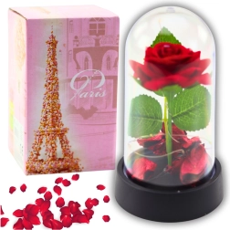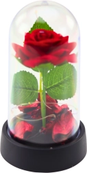 Průhledná kopule růži chrání před prachem a zároveň ji efektně vystavuje ze všech úhlů. Stabilní plastová základna zajišťuje bezpečné umístění. Napájení na baterie umožňuje snadné ovládání bez kabelů, takže dekoraci můžete umístit kamkoliv.