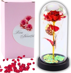 Věčná růže ve skleněné kopuli s osvětlením LED je elegantní a symbolický dar. Symbolizuje lásku a city, které nikdy nevyblednou. Růže si zachovává svou krásu navždy, aniž by vyžadovala nějakou péči. Delikátní LED světlo podtrhuje krásu růže a vytváří teplou atmosféru, ideální pro dekorační účely nebo romantické chvíle. Elegantní skleněná kopule chrání růži a umožňuje si její kouzlo vychutnat z každého úhlu. Pevný a stabilní plastový podstavec zajišťuje bezpečnost a estetičnost daru.