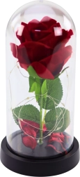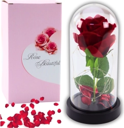 LED osvětlení jemně zdůrazňuje krásu růže a vytváří teplou atmosféru, ideální pro dekoraci interiérů a romantické chvíle. Jemné plátky růží vznášející se v kopuli dodávají eleganci a romantiku celé kompozici.