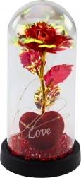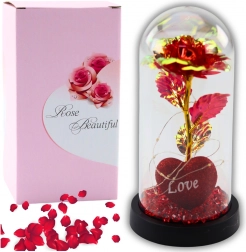 Věčná růže v červené barvě s srdíčkem a nápisem "LOVE", umístěná v elegantní kopuli s jemným LED osvětlením, nabízí jedinečný a symbolický dárek. Díky ozdobným červeným korálkům vytváří úžasný vizuální efekt, ideální pro romantické příležitosti.