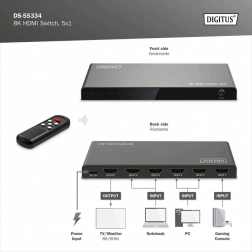 Rozšiřte svůj televizor či monitor o další porty HDMI a přepínejte mezi až pěti zdroji jedním kabelem. Přepínač DIGITUS nabízí 8K/60 Hz (4:4:4), HDMI 2.1, HDR a HDCP 2.3. Ovládání je snadné díky dálkovému ovladači i automatickému přepínání, napájení zajišťuje USB‑C a odolné kovové šasi se hodí do každé sestavy.