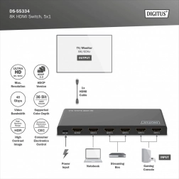 Potřebujete více HDMI vstupů bez neustálého přepojování kabelů? Kompaktní přepínač DIGITUS 5×1 přivede až pět HDMI zařízení do jediného HDMI portu vašeho TV, monitoru či projektoru. Ideální i k nástěnné instalaci TV – stačí jediný HDMI kabel k obrazovce a přepínáte pohodlně na dálku.