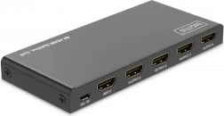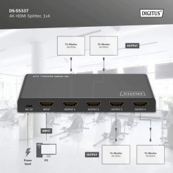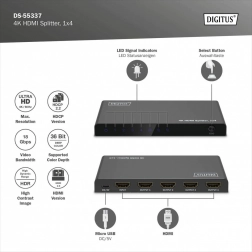 HDMI splitter DIGITUS duplikuje audio‑video signál z jednoho zdroje do čtyř výstupů v maximální kvalitě 4K při 60 Hz (4:4:4). Díky řízení EDID (Auto / Copy / Downscaler) automaticky rozpozná připojené displeje nebo přizpůsobí parametry pro bezproblémové zobrazení na různých monitorech současně.