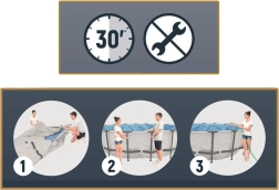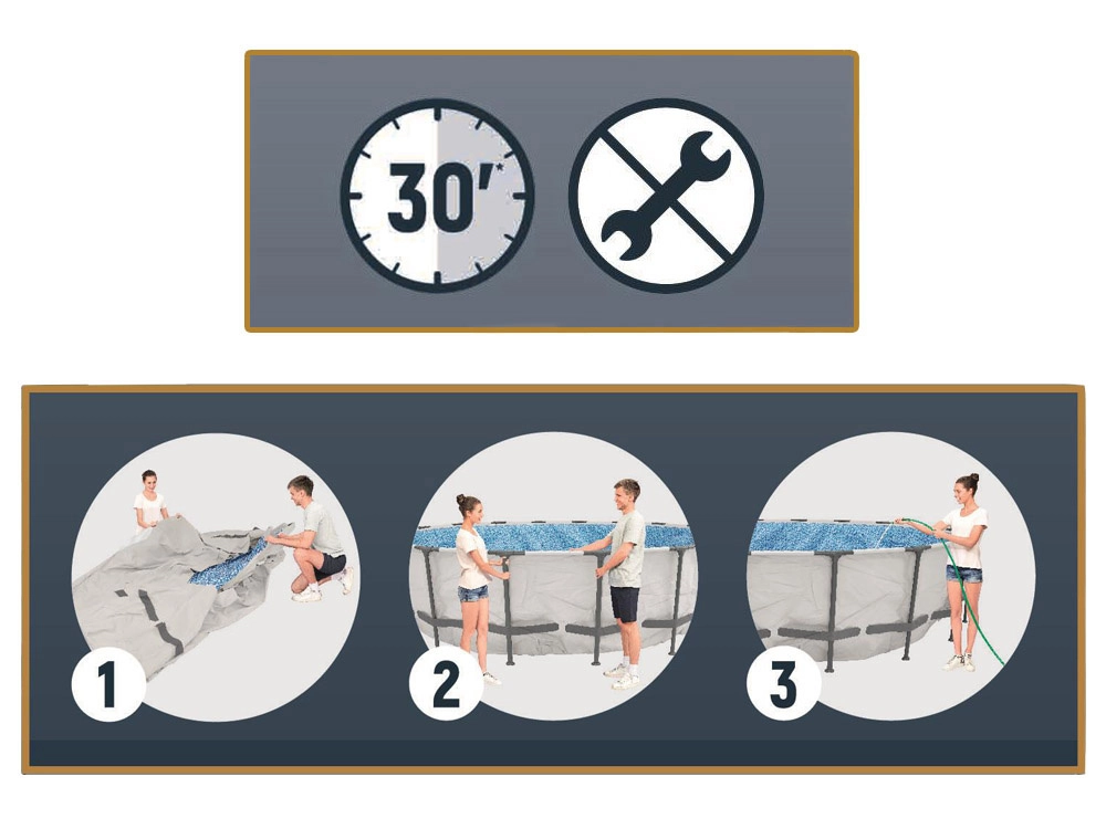 Součástí balení je filtrační čerpadlo s cartridgovým filtrem typu I, hadice, sítka a spony – vše, co potřebujete pro rychlé zprovoznění a křišťálově čistou vodu. Montáž je rychlá a jednoduchá a zvládnete ji bez nářadí.