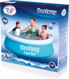 Nafukovací bazén Bestway Fast Set s průměrem 183 cm a výškou 51 cm je praktickým a ekonomickým řešením pro domácí použití. Vyroben je z odolného materiálu DuraPlus™, který zajišťuje trvanlivost, odolnost vůči UV záření a mechanickému poškození. Snadno ho postavíte na trávu nebo tvrdý, rovný povrch.