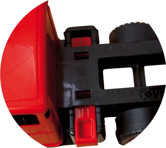 Korbu lze zajistit proti samovolnému vyklopení, široká kola zajišťují stabilitu na různých površích a certifikace Bezpečná a kvalitní hračka garantuje vysoké nároky na bezpečnost a provedení.